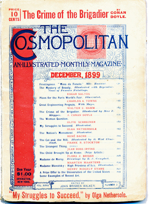 Cosmopolitan magazine started in 1886 as a family magazine, but two years later its founding company was failing.1 John Brisben Walker acquired the magazine in 1889 and reinvented it. Notable authors, both of fiction and nonfiction, became associated with the magazine, from A. Conan Doyle to Mark Twain. By 1891, at least, Walker was also contributing articles he had written. The following compilation is incomplete, but will be updated as new information becomes available. Walker sold the magazine to Hearst Co. in 1905, and returned to Colorado to launch an entrepreneurial career in a different field.